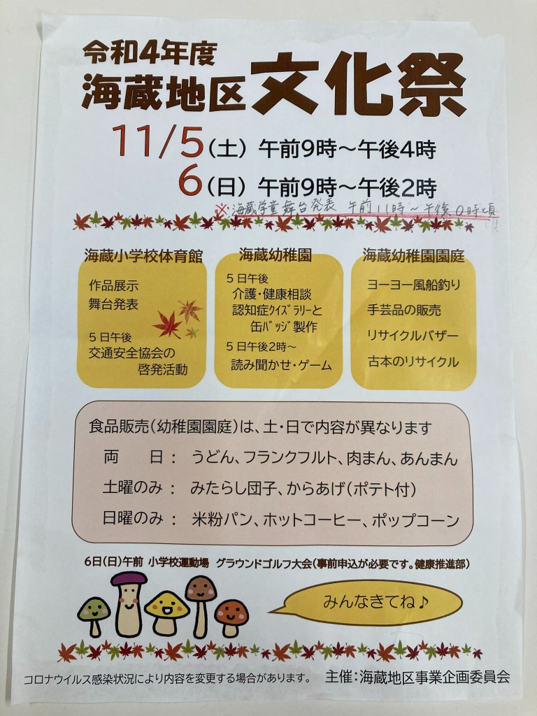 海蔵地区文化祭があります 投稿者:海蔵学童保育所2022年10月14日2022年10月13日カテゴリー:未分類 11月5・6日に海蔵地区文化祭があります。この文化祭で、海蔵学童が舞台発表をする予定です。皆さんぜひとも見に来てみてはいかがでしょうか。 ₍コロナウイルス感染状況により内容を変更する場合があります。₎ 関連