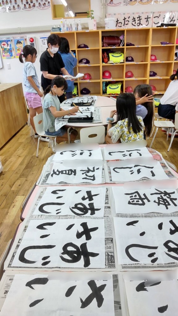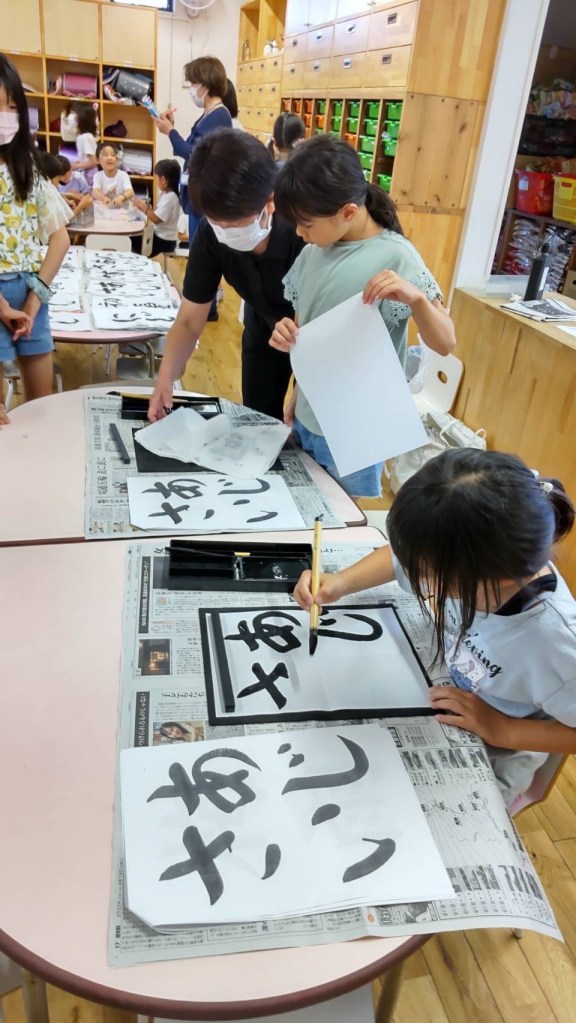 ↑の写真は、あじさいを書いている子と、紙で習字の墨を取ってもらっている写真です。こんな感じで書いているんですね。