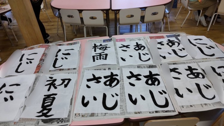 今回は、梅雨に関する文字を書きます。3年生は「にじ」4年生は「あじさい」5年生は「梅雨」6年生が「初夏」です。5年生からは、漢字を書きます。文字の大きさとバランスが難しいですね。