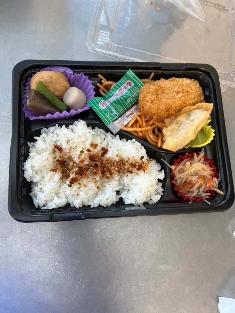 ↑これは、今日、出たお弁当です。このお弁当もボリュームがあって、クリームコロッケにパスタ、餃子の入った満足間違いなしのお弁当でした。このようなおいしいしたくさん食べられるお弁当が出るので今日は何かといつも楽しみにしています
