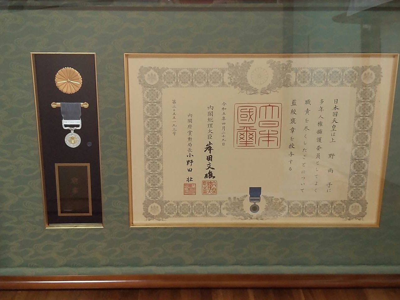 私たち海蔵学童保育所の所長、上野先生がこの度藍綬褒章を受章されました。