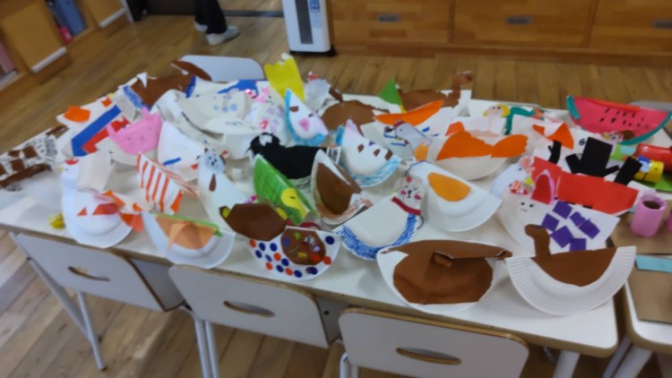 1,2年生の作品 投稿者:海蔵学童保育所2023年9月13日カテゴリー:ホームページ委員会、Sの活動報告 8月23日に、1年生は、紙皿で動くおもちゃを作りました。2年生は、ペーパーの芯を使った森の虫を、作りました。1年生の、紙皿のおもちゃは、紙皿の先をチョンと押すと、前に行ったり後ろに行ったりと、かわいい動き方をします。2年生の作品は、ペーパーの芯を、木の柱の代わりにしたり、ミツバチの丸いからだを、ペーパーの芯で表現していて、ペーパーの芯の特徴を生かしていると、思いました。 関連
