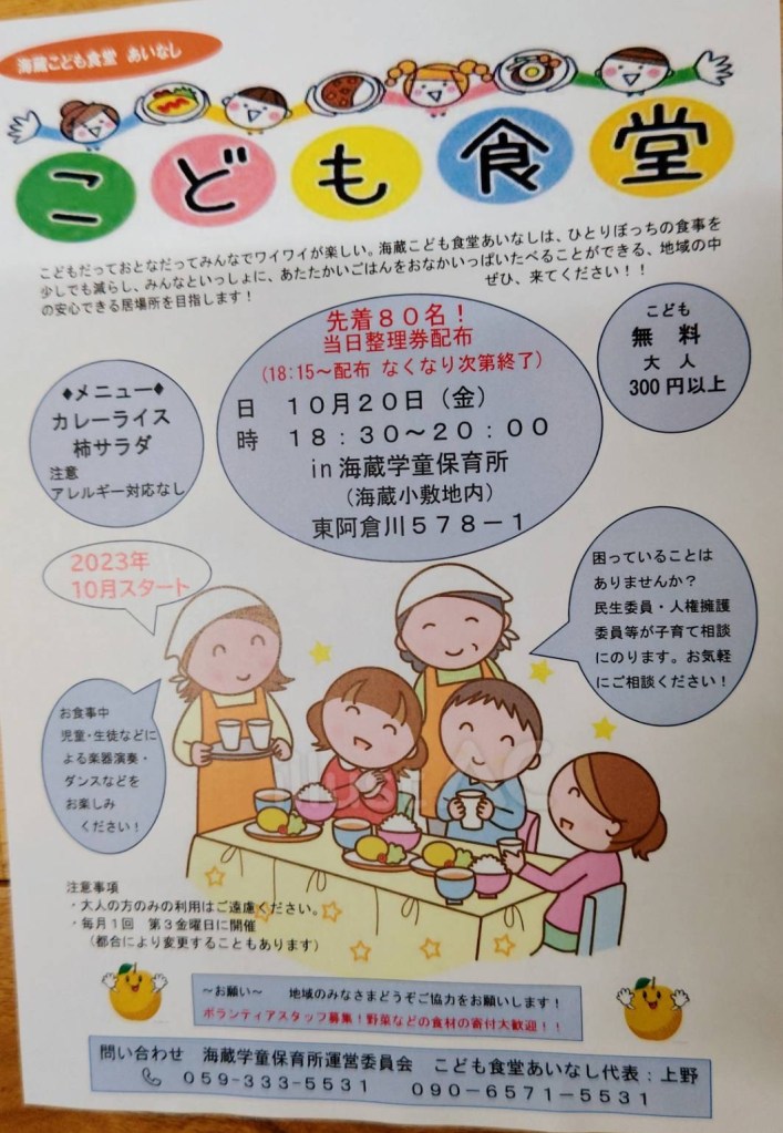 寄付やお問い合わせは、海蔵学童保育所運営委員会 こども食堂あいなし代表 上野