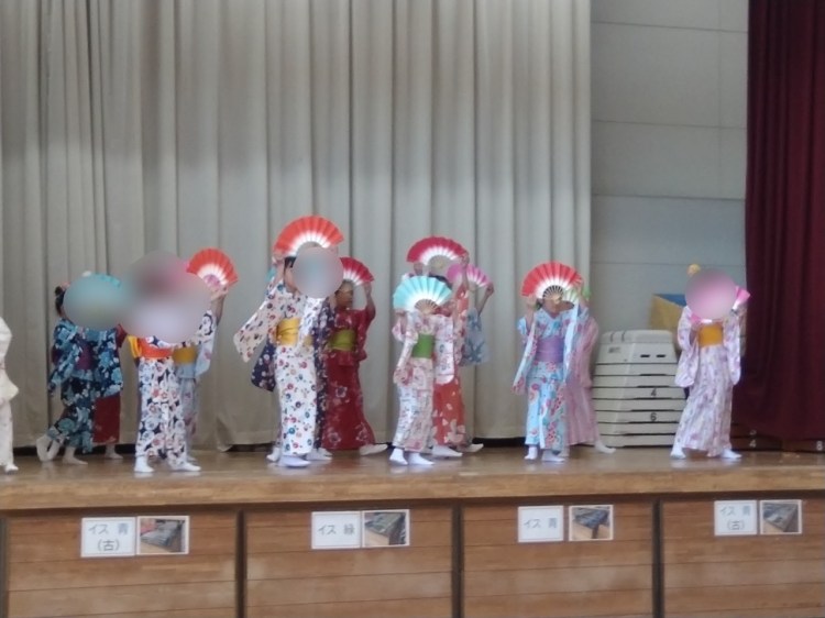 ↑この写真は、2,3,4,5,6年生の日本舞踊です。「菊づくし」、「末広がり」、「さくらさくら」を踊りました。みんなふりつけがそろっていてきれいでしたね。