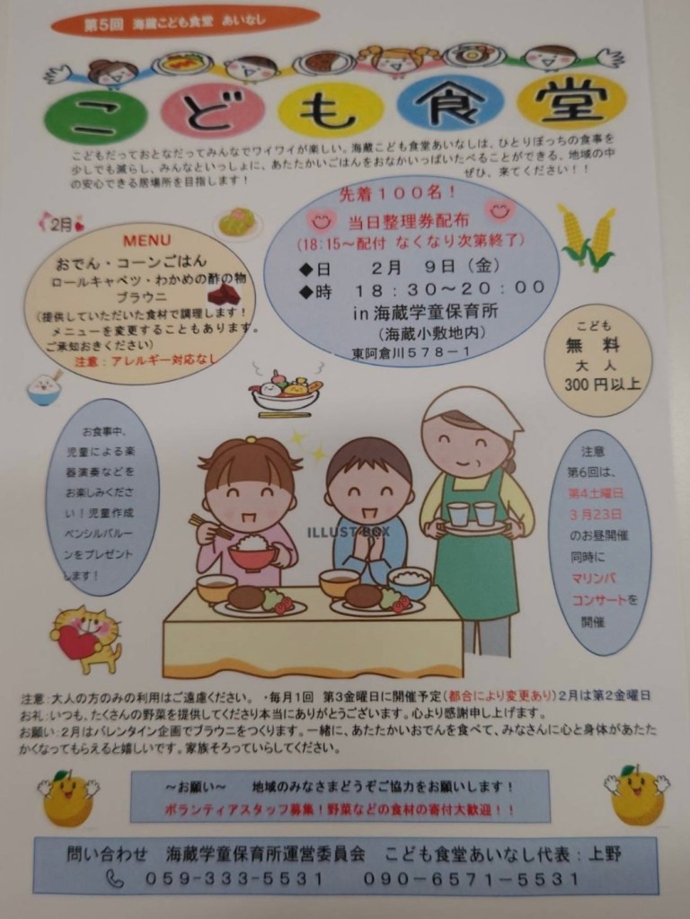 こども食堂のお知らせ 投稿者:海蔵学童保育所2024年2月4日2024年2月4日カテゴリー:未分類 第5回こども食堂を開催します。 継続して続けられること、それは、皆さまのご協力あってそこです。いつもありがとうございます😊 2/9に開催します。 いつもと同じように18:15~整理券を配布します。 みんなでワイワイお越しくださいね。 お待ちしております!! ボランティアのお手伝いや食料のご寄付も大歓迎です。代表の上野までお知らせください。 子ども食堂 あいなし代表 上野尚子 関連