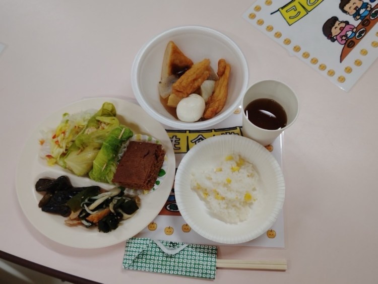 今回のメニューは、コーンご飯、ロールキャベツ、おでん、わかめとしらすの酢の物、レタスの八朔のサラダ、ブラウニーでした。どれもおいしそうですね。