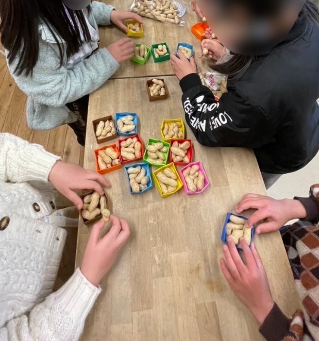 節分 投稿者:海蔵学童保育所2024年2月13日カテゴリー:ホームページ委員会、Sの活動報告 2月3日の学童は、節分を楽しみました。青鬼と赤鬼、お多福の折り紙を作って、板に貼って、落花生を板に向かって投げて、学童に悪いことが起きないように、災いが外に出るように、いいことが学童に入ってくることを、願って投げました。 ↑折り紙の鬼とお多福です。 ↑落花生です。紙の箱に入れていますね。 ↑節分はお菓子がたくさんありますね。恵方巻のようなお菓子もあったみたいです。 関連