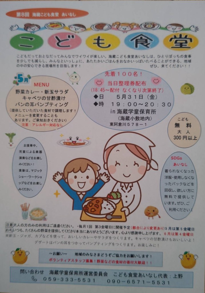 第8回子ども食堂 投稿者:海蔵学童保育所2024年5月8日2024年5月19日カテゴリー:こども食堂、ホームページ委員会、行事 5月31日金曜日 19時~20時半 海蔵学童保育所 (海蔵小学校敷地内)にて開催します。 第8回子ども食堂に来てみてください‼ これは、いままでの子ども食堂の写真です。 関連