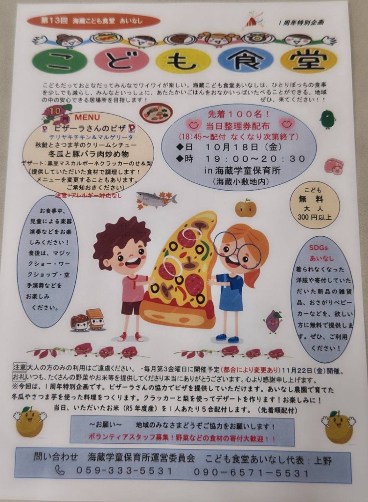 今度、10月18日金曜日に、海蔵学童保育所で、13回目の子ども食堂が開かれます!