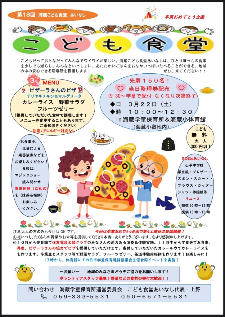 第18回海蔵こども食堂 あいなし のご案内 投稿者:海蔵学童保育所2025年3月2日カテゴリー:こども食堂、ホームページ委員会、行事 早いもので、今年度最後のこども食堂になります。 いつもたくさんのご協力、ご参加ありがとうございます。今回もおいしくて楽しい会にしたいと思います! 今回は時間がいつもと違いますのでご注意ください!ランチタイムになります。 卒業生のみんなで食事を作ります! そしてイベントも盛りだくさん!! お楽しみに!!!! 関連