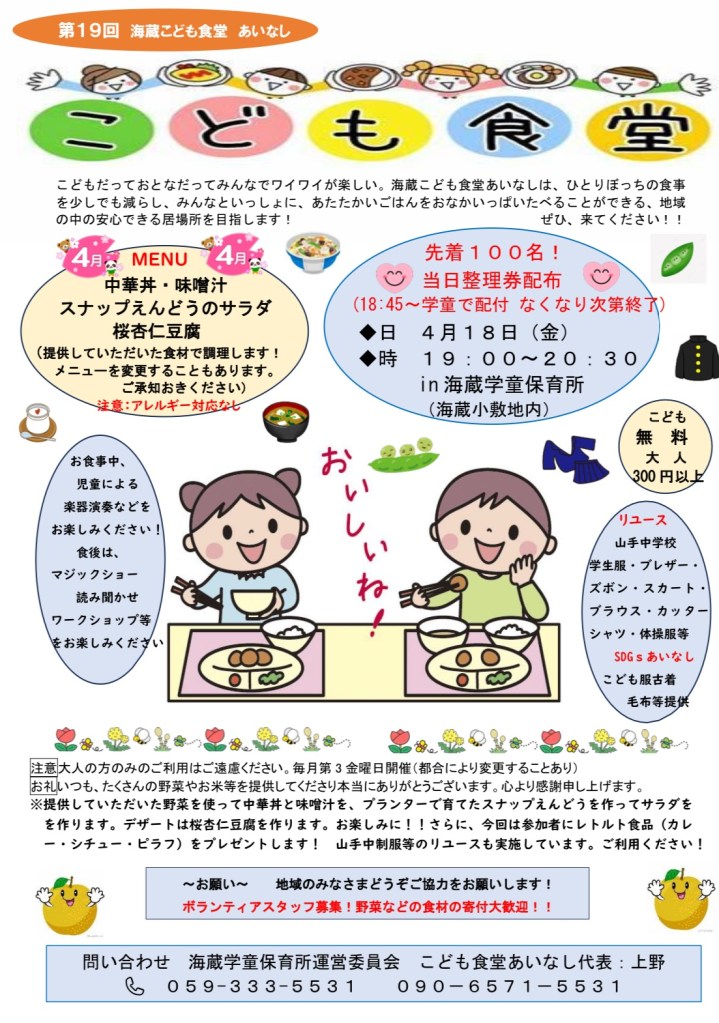 第19回海蔵こども食堂あいなしのご案内 投稿者:海蔵学童保育所2025年4月11日2025年4月11日カテゴリー:未分類 こんにちは。 4月18日金曜日に海蔵こども食堂あいなしを開催します! 今回も、お手伝いしてくださる方や食材の寄付も大歓迎です。いつも皆さまのご協力によりこども食堂あいなしを開催できます。心より感謝いたします。 ボランティアや寄付に関するお問い合わせはこちらからお願いいたします。 今月もみんなで楽しい時間を過ごしましょう!ご参加お待ちしております。 関連