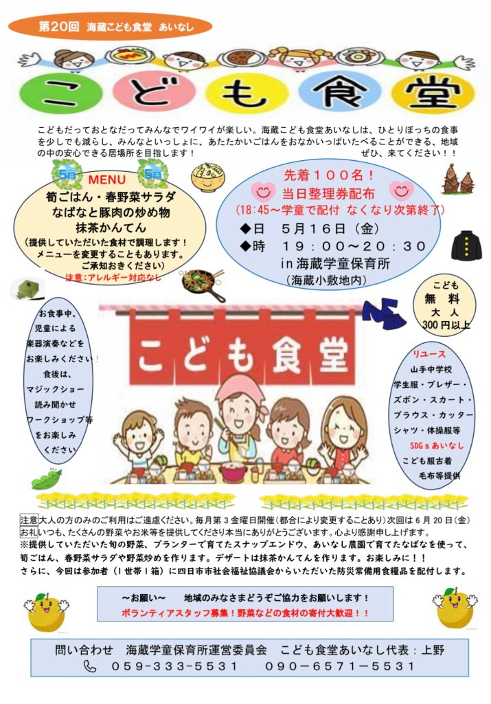 第20回こども食堂あいなしのお知らせ 投稿者:海蔵学童保育所2025年5月8日カテゴリー:こども食堂、ホームページ委員会 今度のこども食堂は5月16日金曜日の、19時から20時30分までです。 今回のメニューは、たけのこご飯、春野菜サラダ、なばなと豚肉の炒め物、抹茶かんてんです! どれも、春らしいメニューですね! アレルギー対応はないのでご注意ください! 当日、整理券発売で先着100名です。 18時45分から学童で配布します。 なくなり次第終了なのでお早めに! 子どもは無料で大人は300円からです。 ぜひ、子ども食堂に来てみてください!! 関連