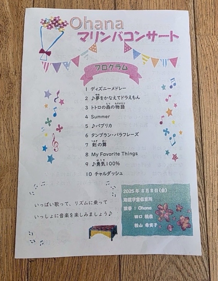 OHANAさんがマリンバコンサートを開いてくれました。 投稿者:海蔵学童保育所2025年8月21日2025年8月21日カテゴリー:ホームページ委員会、行事 OHANAさんが綺麗なマリンバの音色を聞かせてくれました。 たくさんのいい曲をきれいな音色で演奏してくれました。 知っている曲もありそうですね!!! ↑演奏している様子 衣装がきれいですね!! マリンバの色や形もきれいですね✨ ピンクのマリンバがあることに驚きました。 楽しいひと時を過ごせてよかったです!! 関連
