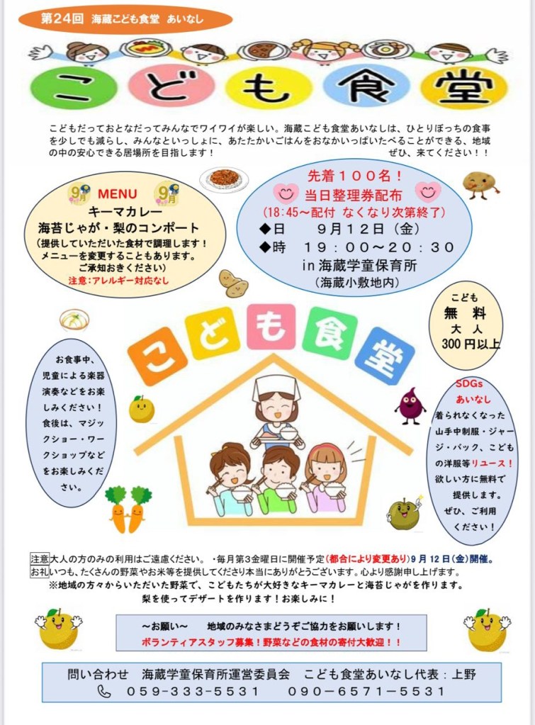 第24回海蔵こども食堂あいなし開催します! 投稿者:海蔵学童保育所2025年9月10日カテゴリー:こども食堂、ホームページ委員会 こんにちは。 9月12日金曜日に海蔵こども食堂あいなしを開催します。 記念すべき24回目はキーマカレーです!! いつもご協力くださる皆様ありがとうございます。そして来てくださる皆さんもありがとうございます! 今回も楽しい時間が過ごせますように。 関連