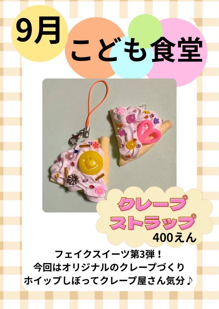 第24回海蔵こども食堂のお知らせ② 投稿者:海蔵学童保育所2025年9月11日カテゴリー:こども食堂、ホームページ委員会 ひなたいろさんのイベントはフェイクスイーツ・クレープを作ります。 遊びに来てくださいね。 第24回海蔵こども食堂あいなしについてはこちらをごらんください。 関連