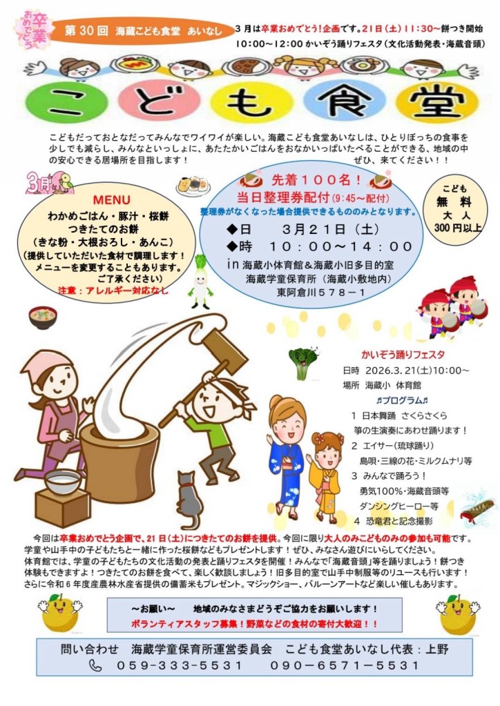 第30回海蔵こども食堂あいなしは、「卒業おめでとう!企画」です!